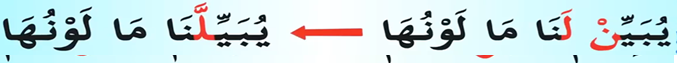 Bakara Süresi 69. Ayet. Sakin nun üzerinden dikkat ederseniz bir tenvinle örnek alıyoruz. Bir de sakin nunlu örnek alıyoruz. Çünkü tenvin de gerçekte sakin nun demektir yani görünmüyor ama içerisinde bir sakin Nun barındırıyor. Şimdi bu örnekte görüyoruz cezimli bir nun ne demiştik. Cezimli bir nun gördüğümüzde sakin bir nun gördüğümüzde ve daha sonra da veya iki ik Üstün iki Esre iki ötre tenvin gördüğümüzde anlayalım ki bir tecvit kuralı mutlaka meydana gelecek bizim için çok önemli. Tecvidin yarısı iki Üstün iki Esre iki ötre ve sakin nun hemen burada baktık bir sakin nun karşımıza çıktı fevkalade güzel örnek. Peki sonra lam harfi geldi lam harfi demek önemli yani bu konumuzda Lam ve Ra harfi üzerinde duracağız lam önemli yin diye okuyoruz ama zor geliyor ne yaptık? Buradaki Nunu iptal ettik sakin Nunu iptal ettik onun yerine lam harfini ne yaptık? Lam harfini şeddeli yaptık. İki harfi bir harfe dönüştürmüş olduk bir harfe dönüştürmüş olduk. Dolayısıyla ne yaptı kolaylaştı ve hem de güzelleşti. Şu sol bölümü okunan bölümünü yani nasıl okunması gerektiğini (Tecvitli) gösteren bölümdür.