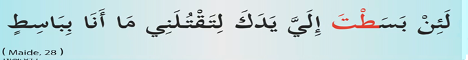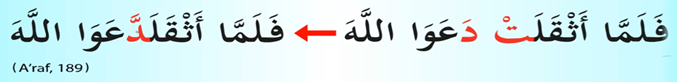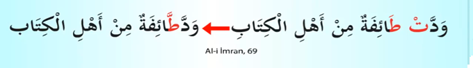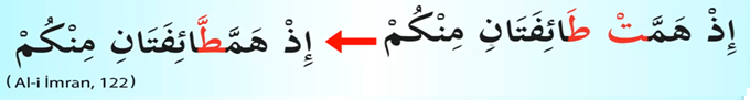 Araf Süresi 189. Ayet. Evet sesleri itibariyle birbirine yakın olan iki harfimiz var TA ve DAL harfleri bu iki harf Kur’an-ı Kerim’de birkaç yerde yan yana geliyor ve birinci harfi telaffuz etmiyoruz okumuyoruz ikinci harfi şeddeliyoruz. Burada da görebiliyoruz kırmızı karakterde ta harfinin sakin halini göstermiş dal harfinin de harekeli halini okunma pozisyonunda ta harfini iptal ediyoruz ve dal harfi olarak okuyoruz. Çok yaygın bir kural değil ama birkaç yerde Kur’an-ı Kerim’de geçtiği için bunu birlikte terennüm etmemiz gerekiyor.