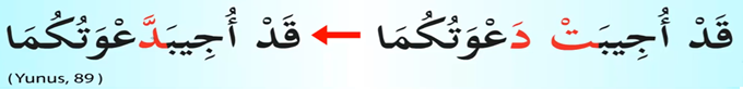 Yunus Süresi 89. Ayet. Yunus suresinden bir ayeti kerimede diye okumamız gerekirken ta harfiyle dal harfi ses itibariyle birbirine yakın olan harf olması hasebiyle harfler olması hasebiyle ta harfini iptal ediyoruz ve dal harfini Şurada da görüldüğü gibi şeddeli okuyoruz.