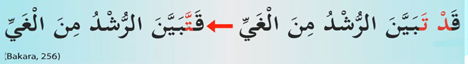 Bakara Süresi 256. Ayet. Şimdi alacağımız örneklerde ise dal harfi önce ta harfi sonuna geliyor hiç yine okuma değişmiyor. Evet şu Bunun yerine dal harfini iptal ediyoruz ve ta harfini şurada gördüğünüz gibi şeddeliyoruz.