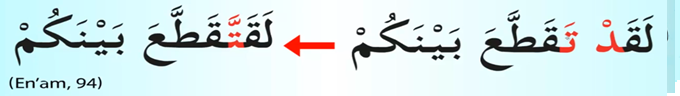 En’am Süresi 94. Ayet. Enam suresinden bir ayeti kerimeden aldığımız bir örnek. Şurada göründüğü gibi evet dal harfi sakin ta harfi harekeli ta harfini şeddeleyerek okuyoruz.