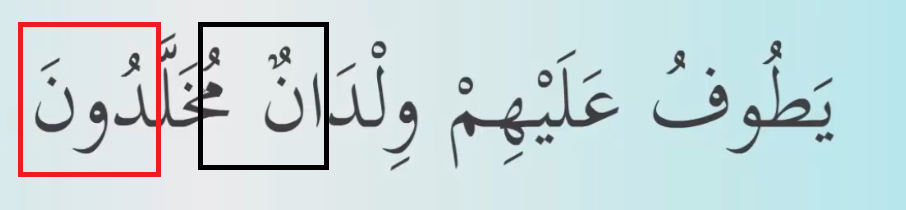 Yukarıda, Siya kare ile çizilmiş alandan tenvinden sonra mim geldi ve “İdğâm-ı Mea’l–Ğunne” yapıyoruz. Kırmızı kare ile çizilmiş alanda; Del harfinden uzatma harfi vav harfi geliyor med yapıyoruz.