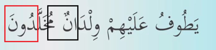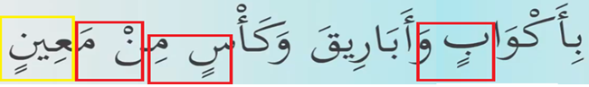 Bir sonraki ayeti kerime evet burada bakalım tecvit kuralımız var mı nerede tenvin görüyoruz mutlaka bir tecvit Kaidesi vardır tenvinden sonra vav harfi geliyor ve İdğâm-ı Mea’l–Ğunne sarı çizili yer. Evet ayeti kerimenin sonunda ik Üstün ne demekti iki Üstün kırkmızı çizili kısım sakin yapmıyoruz burada Elif üzere Med yapıyoruz zaten Elif harfin üzerinde yazıldığını görüyoruz.