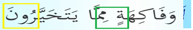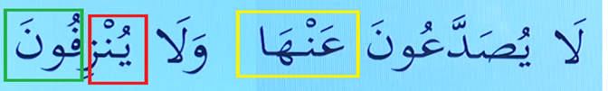 Sakin nun harfinden sonra zey harfi kırmızı çizili kısım geldi ihfa yapıyoruz. Nun harfini akıtma yapıyoruz. Ayet-i kerimenin son harfinin harekesi Üstün sükun yeşil kısım yapıyoruz.