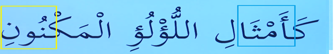 İki kelimeden oluşan bir ayeti kerime yine tenvin gördük tenvinden Sonra ayın harfi geldi Öyleyse ne yapıyoruz son harfi geldi İzhar yapıyoruz herhangi bir tutma söz konusu değil nun harfini belirgin bir şekilde okuyup üzerinde oyalanmadan geçiyoruz. Son harfin harekesi iki ötre yine sakin kılıyoruz.