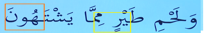 Sarı çizili yerde İdğâm-ı Mea’l–Ğunne  yapıyoruz ve kırmızı çizili yerde fetha Sükun yapıyoruz.